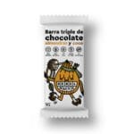 Barrita vegana tricapa. Elaborada con ingredientes naturales y nutritivos en crudo, conservando asì los nutrientes inalterados. Abajo un brownie de dàtiles, en el medio una untuosa capa de crema de manì, topeada con chocolate raw.